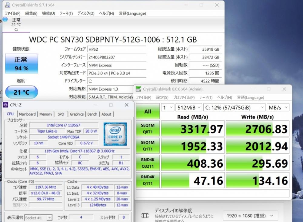 | CPU: 超高速 Intel 卓越性能 第11世代Core i7-1185G7 3.0Ghz、 4コア8スレッド (ターボ・ブースト利用時の最大周波数 4.8GHz) |