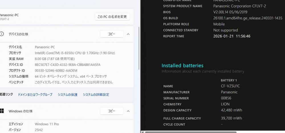 中古 フルHD 14型 Panasonic LV7RDAVS Windows11 第8世代 i5-8350U 8GB 256GB-SSD カメラ 無線 Office付き 中古パソコン 税無 管:1340m