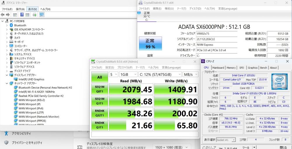 CPU:    超高速 Intel 超高性能 第10世代Core i7-10510U 1.8Ghz、 4コア8スレッド (ターボ・ブースト利用時の最大周波数 4.9GHz)