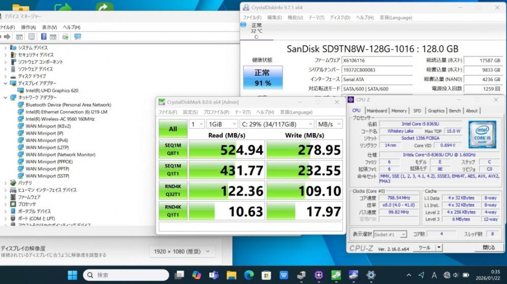 | CPU: 超高速 Intel 高性能 第8世代Core i5-8365u 1.6Ghz、 4コア8スレッド (ターボ・ブースト利用時の最大周波数 4.1GHz) |