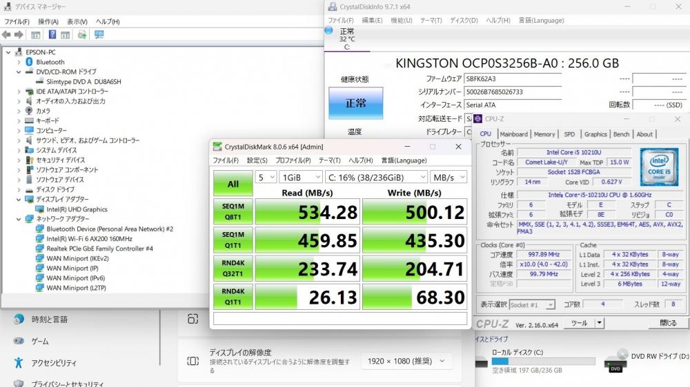 | CPU: 超高速 Intel 超高性能 第10世代Core i5-10210U 1.6Ghz、 4コア8スレッド (ターボ・ブースト利用時の最大周波数 4.2GHz) |