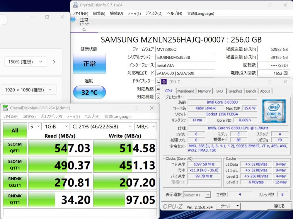| CPU: 超高速 Intel 高性能 第8世代Core i5-8350U 1.7Ghz、 4コア8スレッド (ターボ・ブースト利用時の最大周波数 3.6GHz) |