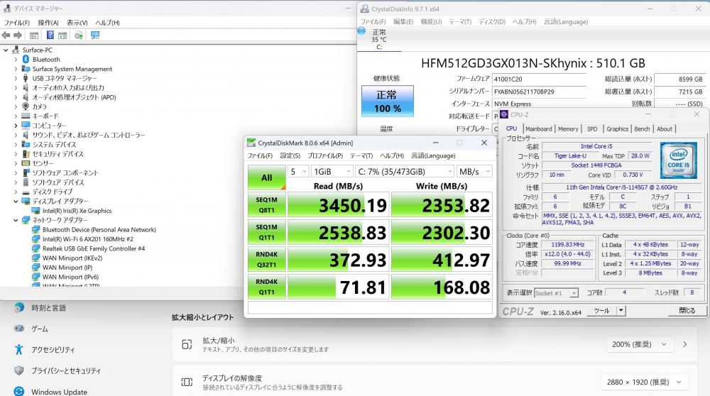 | CPU: 超高速 Intel 卓越性能 第11世代Core i5-1145G7 2.6Ghz、 4コア8スレッド (ターボ・ブースト利用時の最大周波数 4.4GHz) |