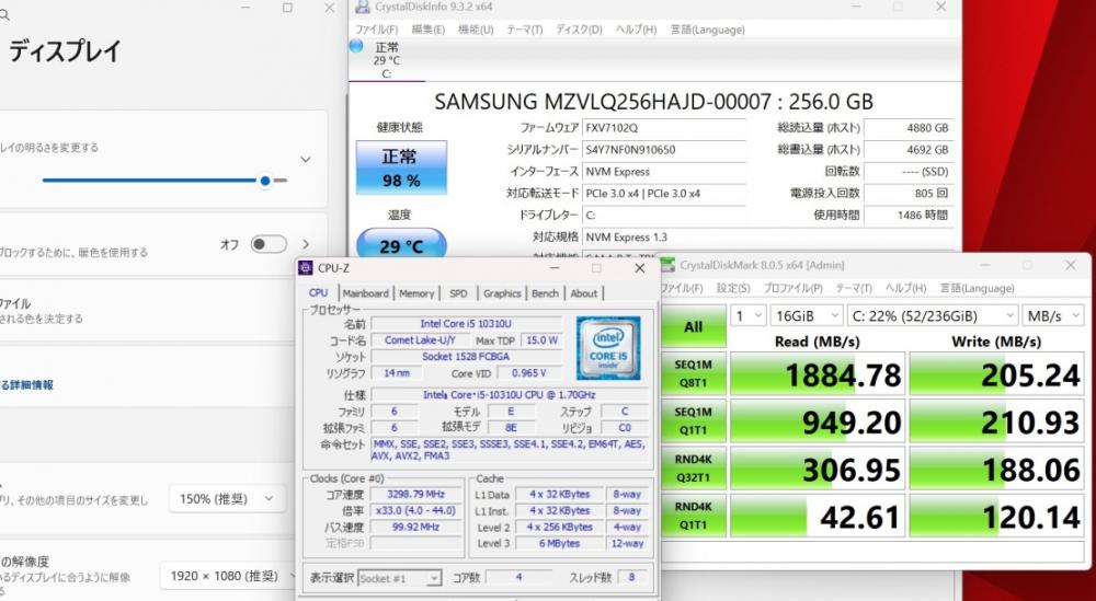 | CPU: 超高速 Intel 超高性能 第10世代Core i5-10310u 1.7Ghz、 4コア8スレッド (ターボ・ブースト利用時の最大周波数 4.4GHz) |