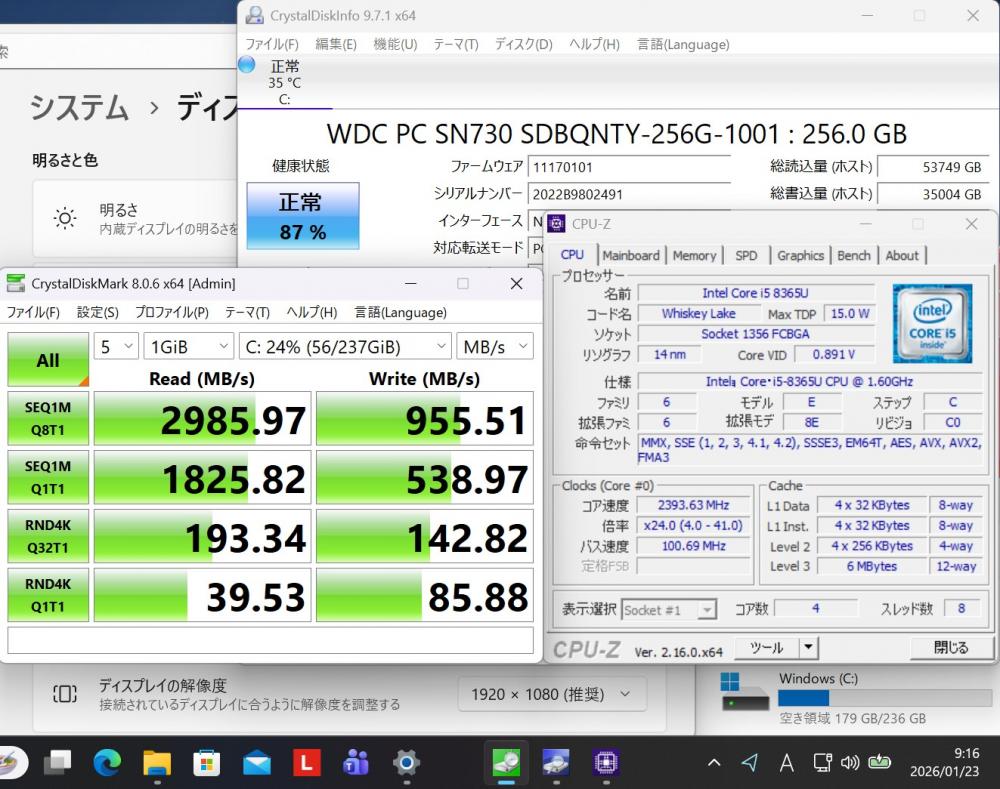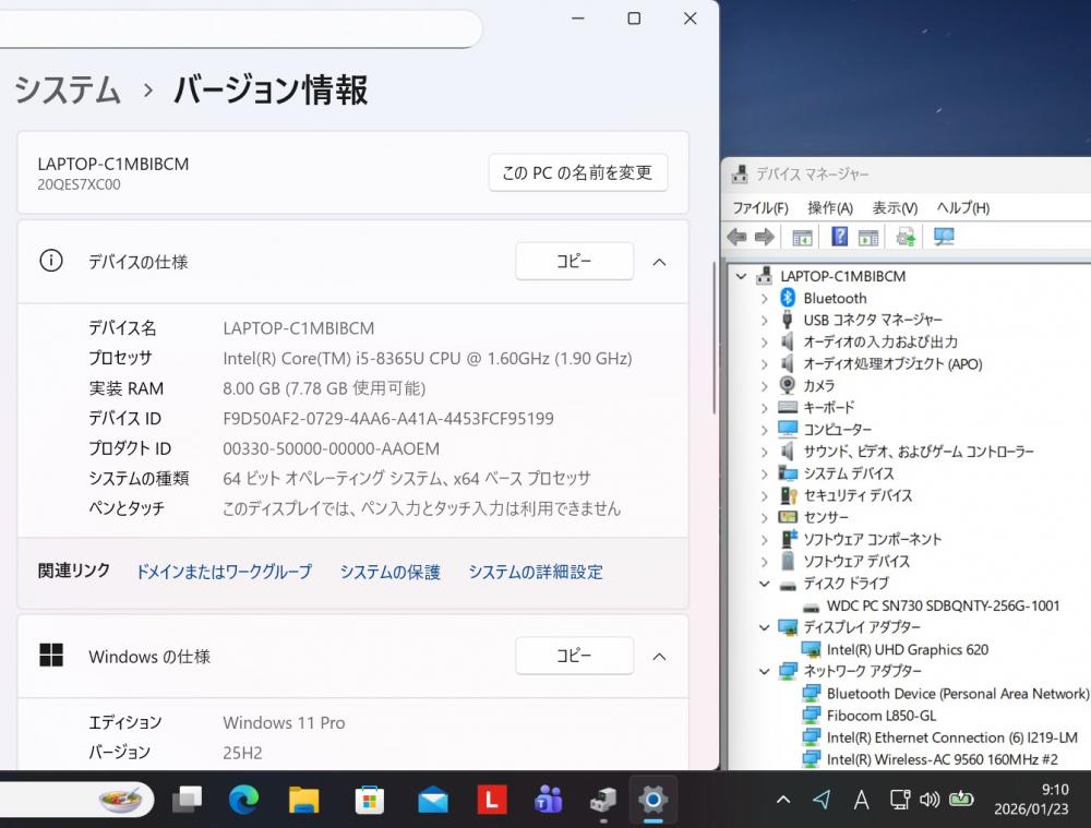 | CPU: 超高速 Intel 高性能 第8世代Core i5-8365U 1.6Ghz、 4コア8スレッド (ターボ・ブースト利用時の最大周波数 4.1GHz) |