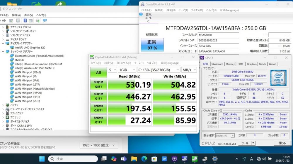 | CPU: 超高速 Intel 高性能 第8世代Core i5-8365u 1.6Ghz、 4コア8スレッド (ターボ・ブースト利用時の最大周波数 4.1GHz) |