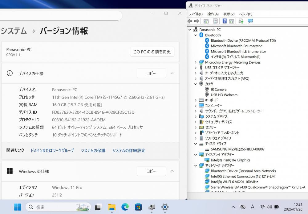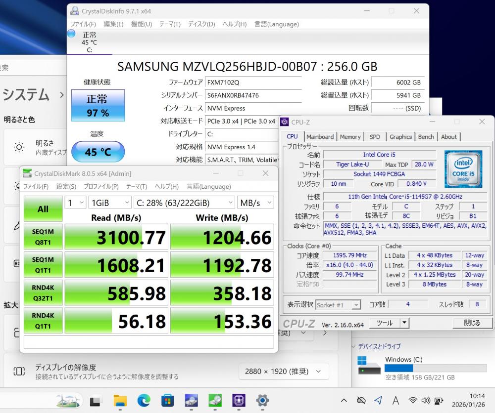 CPU:    超高速 Intel 卓越性能 第11世代Core i5-1145G7 2.6Ghz、 4コア8スレッド (ターボ・ブースト利用時の最大周波数 4.4GHz)