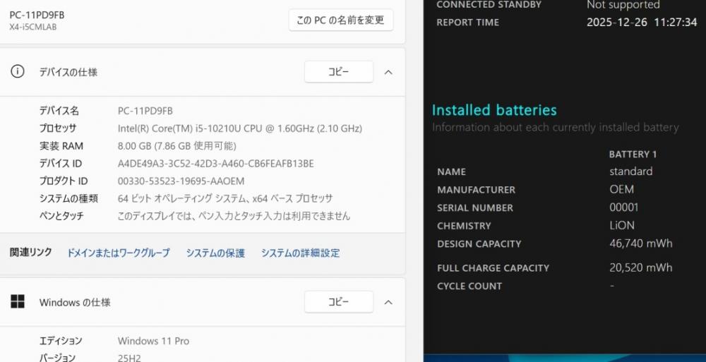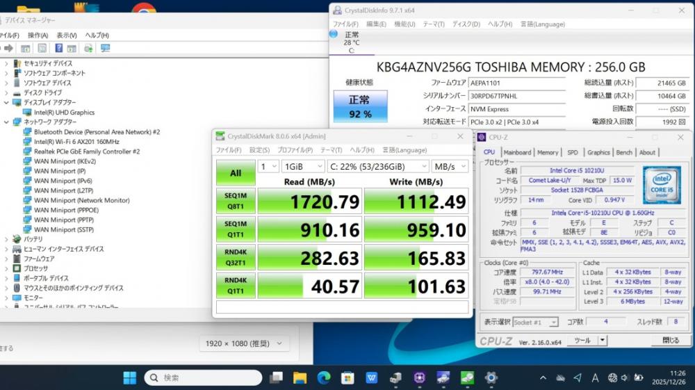 | CPU: 超高速 Intel 超高性能 第10世代Core i5-10210u 1.6Ghz、 4コア8スレッド (ターボ・ブースト利用時の最大周波数 4.2GHz) |