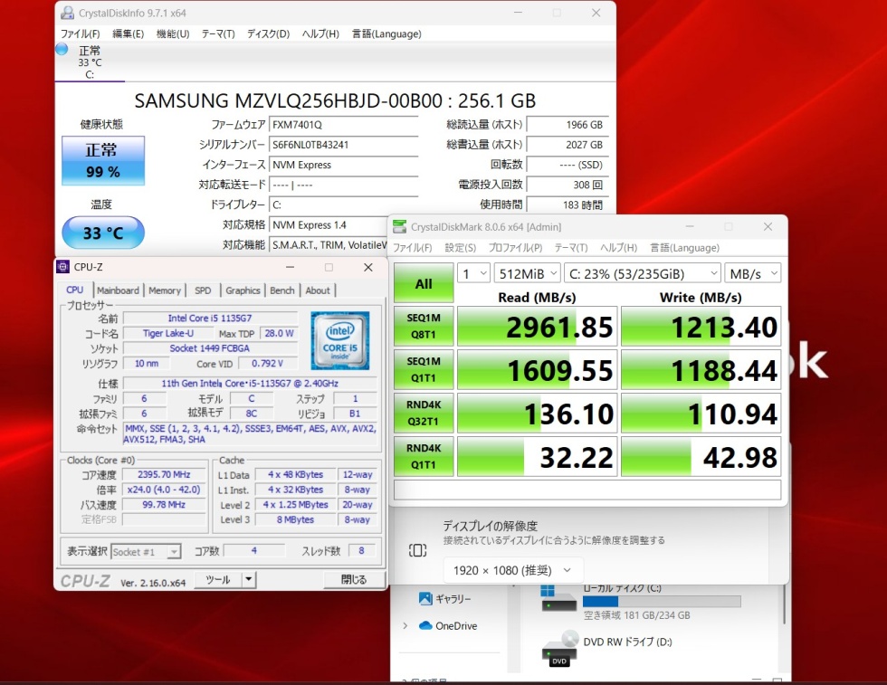 | CPU: 超高速 Intel 卓越性能 第11世代Core i5-1135G7 2.4Ghz、 4コア8スレッド (ターボ・ブースト利用時の最大周波数 4.2GHz) |