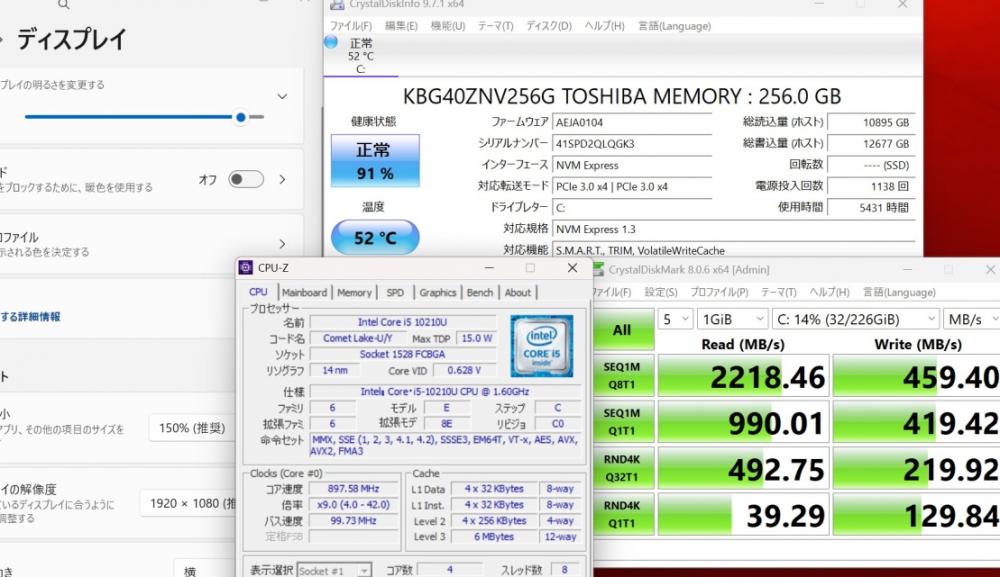 | CPU: 超高速 Intel 超高性能 第10世代Core i5-10210U 1.6Ghz、 4コア8スレッド (ターボ・ブースト利用時の最大周波数 4.2GHz) |