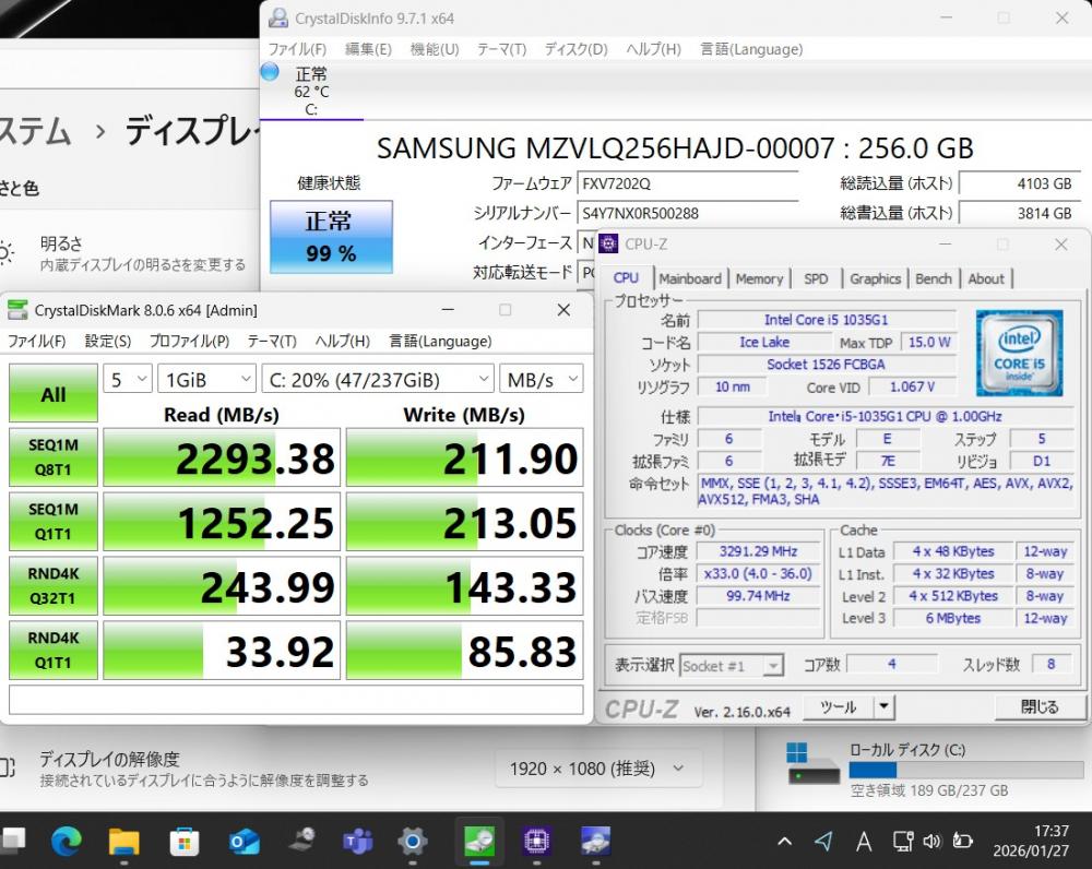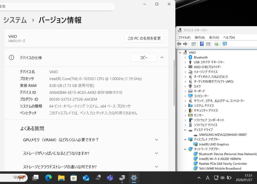 | CPU: 超高速 Intel 超高性能 第10世代Core i5-1035G1 1.0Ghz、 4コア8スレッド (ターボ・ブースト利用時の最大周波数 3.6GHz) |