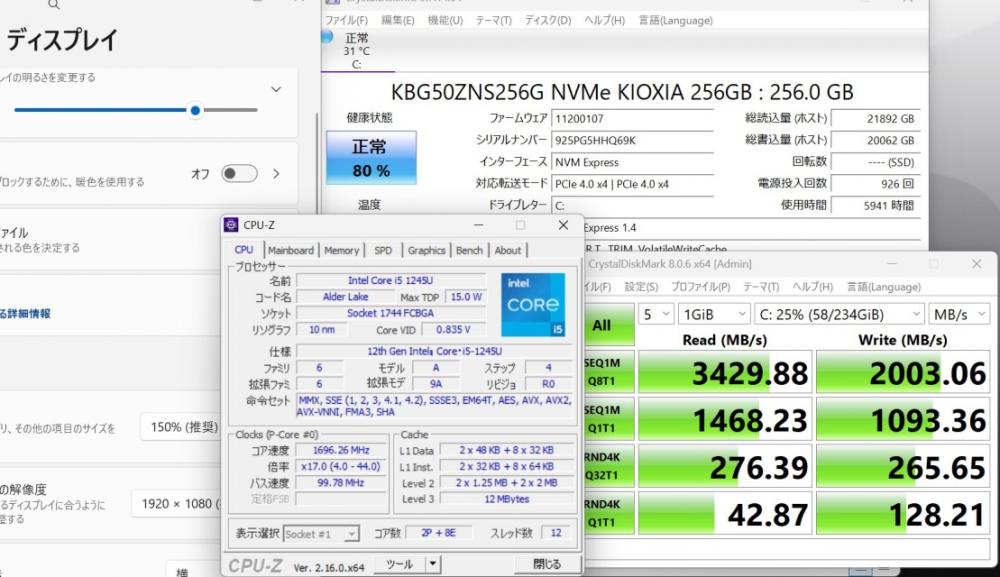 | CPU: 超高速 Intel 10コア 卓越性能 第12世代Core i5-1245u 1.6Ghz、 10コア12スレッド (ターボ・ブースト利用時の最大周波数 4.4GHz) |
