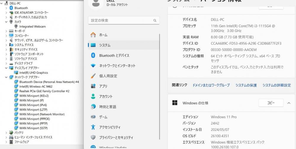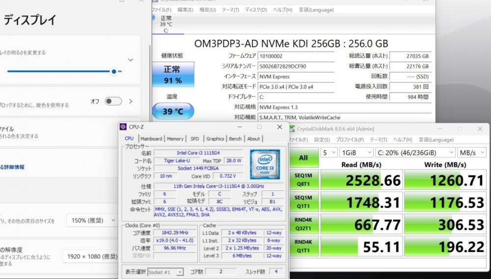 | CPU: 超高速 Intel 卓越性能 第11世代Core i3-1115G4 3.0Ghz、 2コア4スレッド (ターボ・ブースト利用時の最大周波数 4.1GHz) |