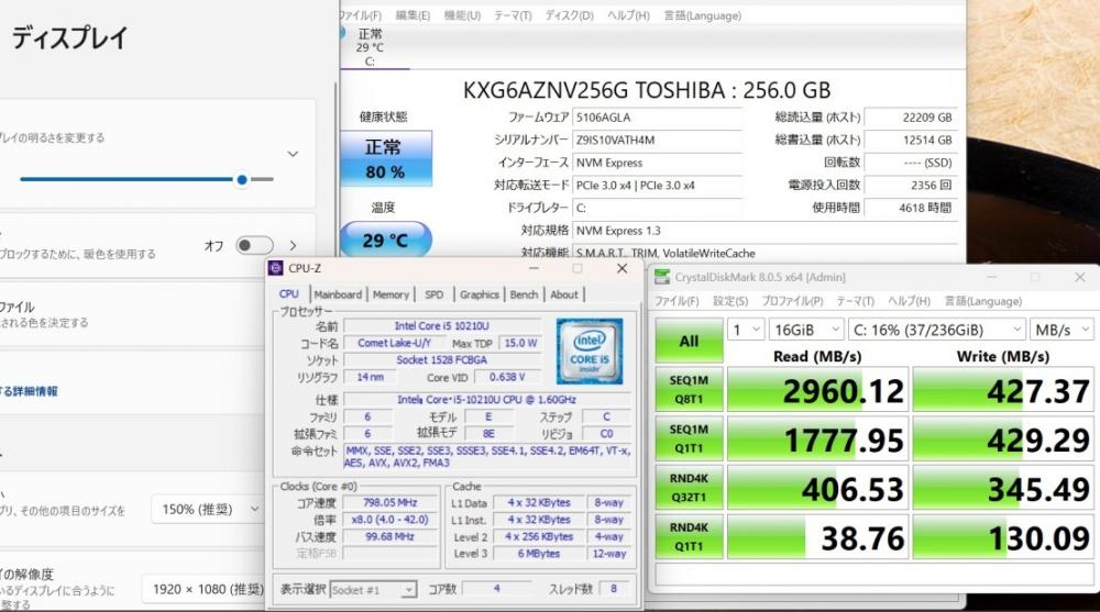 | CPU: 超高速 Intel 超高性能 第10世代Core i5-10210u 1.6Ghz、 4コア8スレッド (ターボ・ブースト利用時の最大周波数 4.2GHz) |