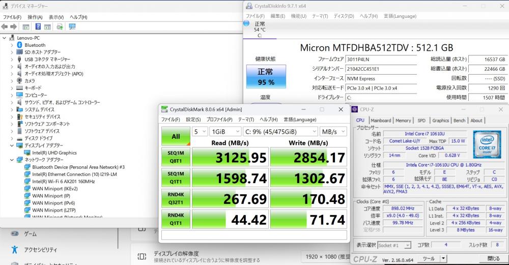 | CPU: 超高速 Intel 超高性能 第10世代Core i7-10610U 1.8Ghz、 4コア8スレッド (ターボ・ブースト利用時の最大周波数 4.9GHz) |