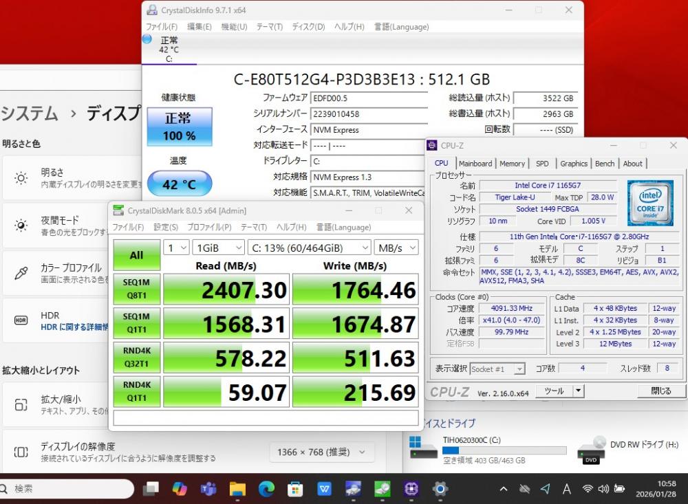 | CPU: 超高速 Intel 卓越性能 第11世代Core i7-1165G7 2.8Ghz、 4コア8スレッド (ターボ・ブースト利用時の最大周波数 4.7GHz) |