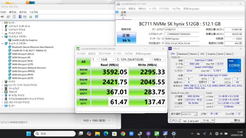 | CPU: 超高速 Intel 10コア 卓越性能 第12世代Core i7-1265u 1.8Ghz、 10コア12スレッド (ターボ・ブースト利用時の最大周波数 4.8GHz) |
