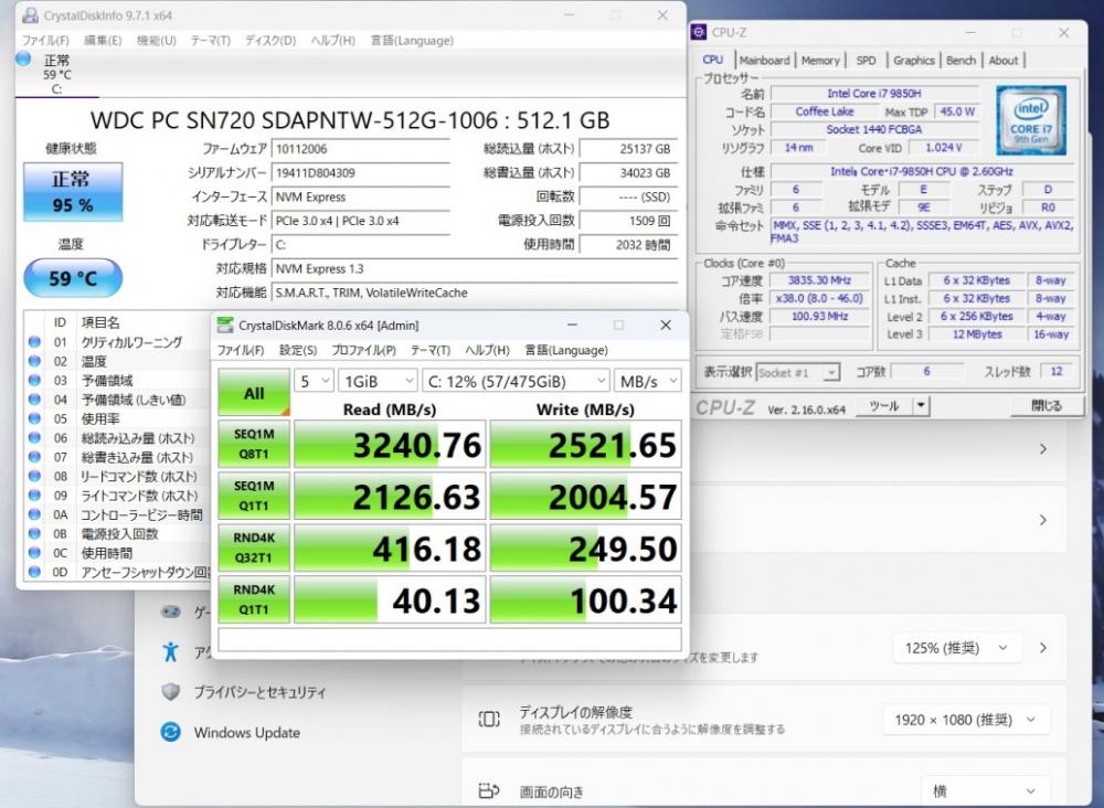 | CPU: 超高速 Intel 超高性能 第9世代Core i7-9850h 2.6Ghz、 6コア12スレッド (ターボ・ブースト利用時の最大周波数 4.6GHz) |