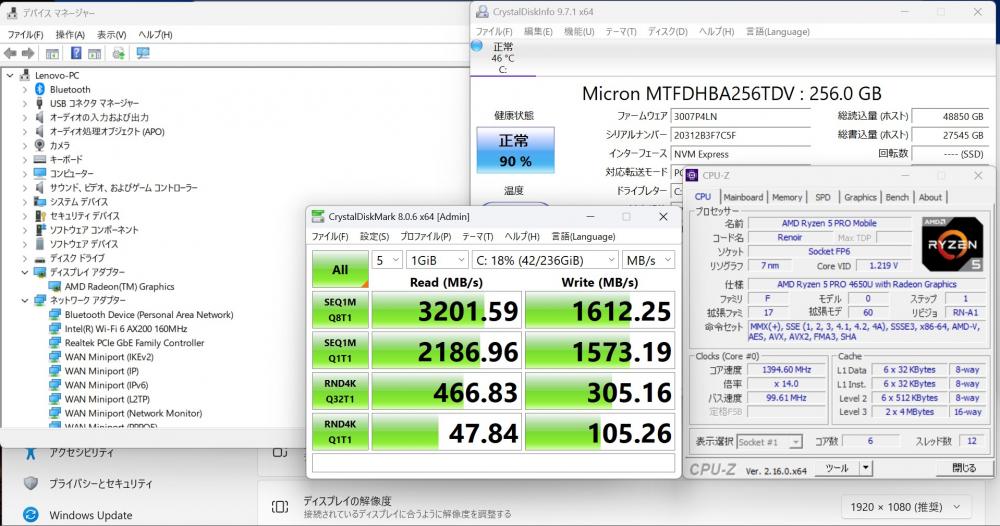 | CPU: 超高速 高性能 AMD Ryzen 5-4650U 2.1Ghz、 6コア12スレッド (ターボ・ブースト利用時の最大周波数 4.0GHz) |