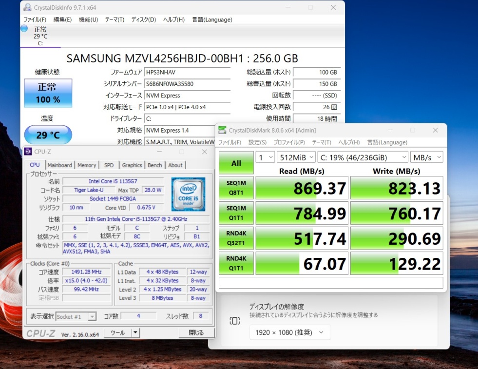 | CPU: 超高速 Intel 卓越性能 第11世代Core i5-1135G7 2.4Ghz、 4コア8スレッド (ターボ・ブースト利用時の最大周波数 4.2GHz) |