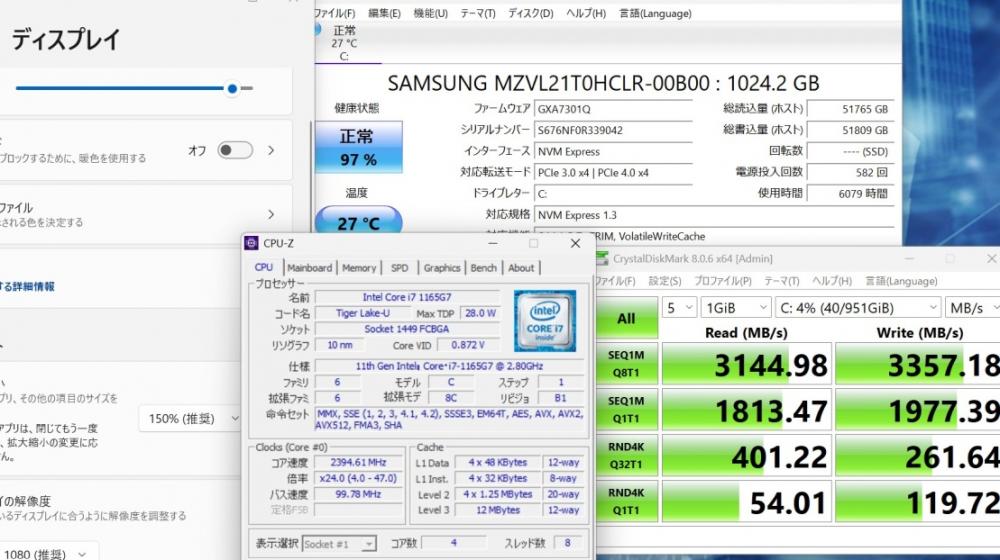 | CPU: 超高速 Intel 卓越性能 第11世代Core i7-1165G7 2.8Ghz、 4コア8スレッド (ターボ・ブースト利用時の最大周波数 4.7GHz) |