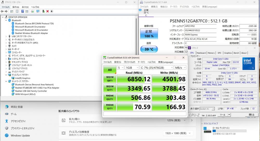 | CPU: 超高速 Intel 10コア 超高性能 第14世代Core 5-120U 1.4Ghz、 10コア12スレッド (ターボ・ブースト利用時の最大周波数 4.0GHz) |