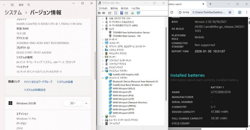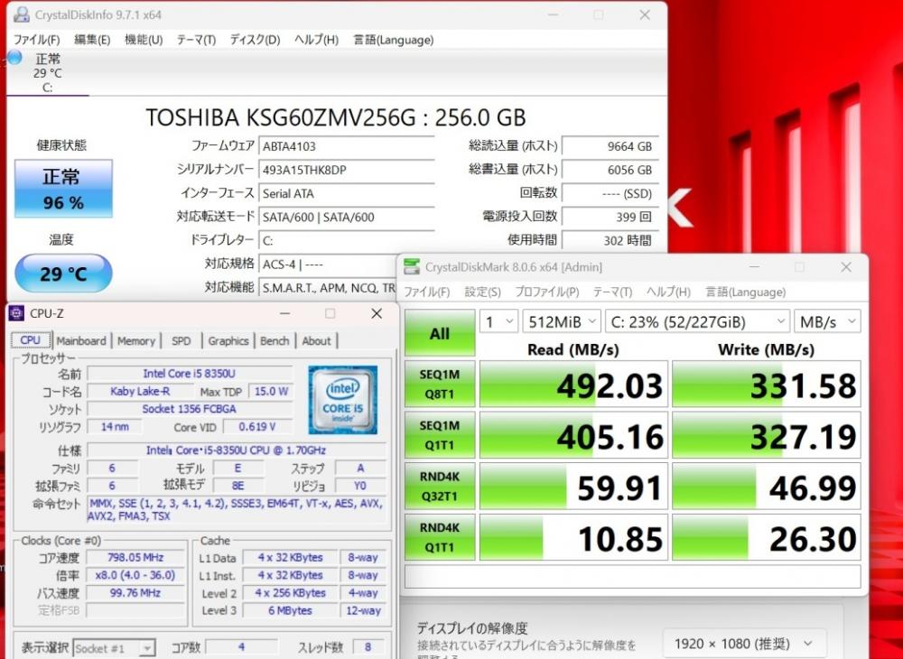 | CPU: 超高速 Intel 高性能 第8世代Core i5-8350U 1.7Ghz、 4コア8スレッド (ターボ・ブースト利用時の最大周波数 3.6GHz) |