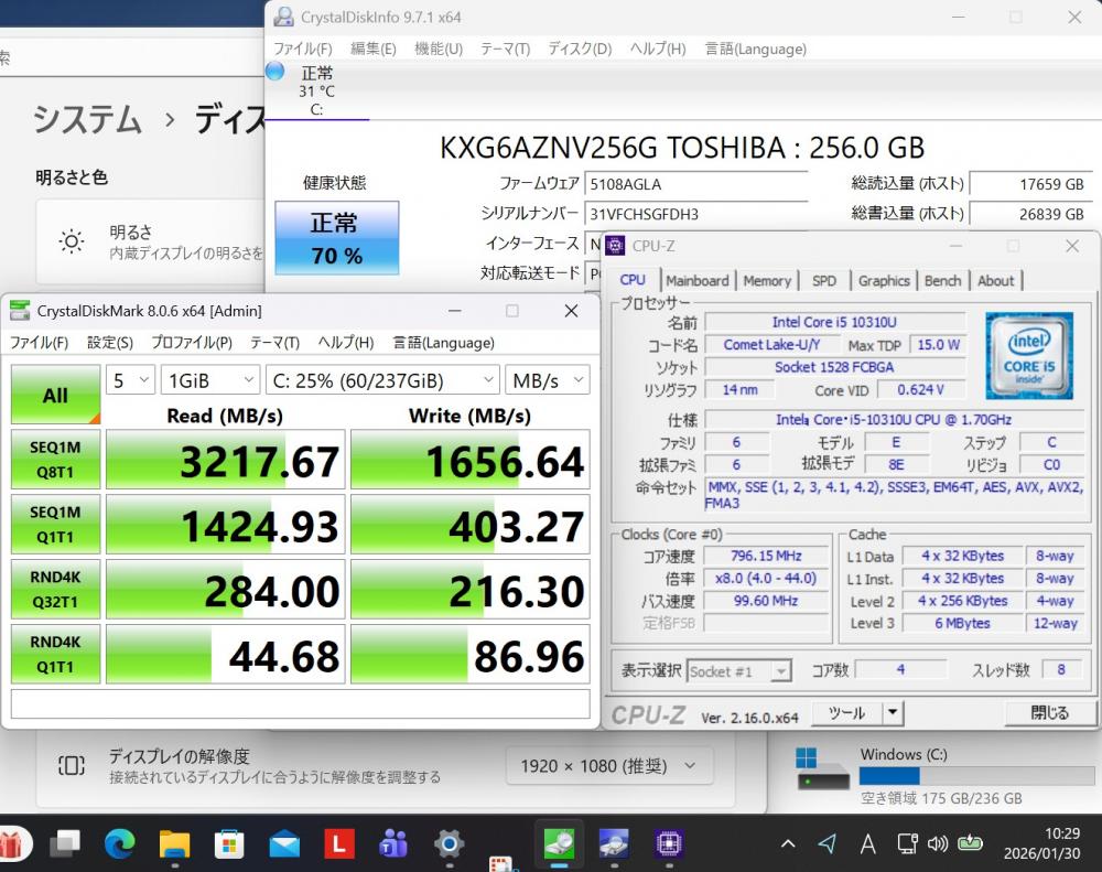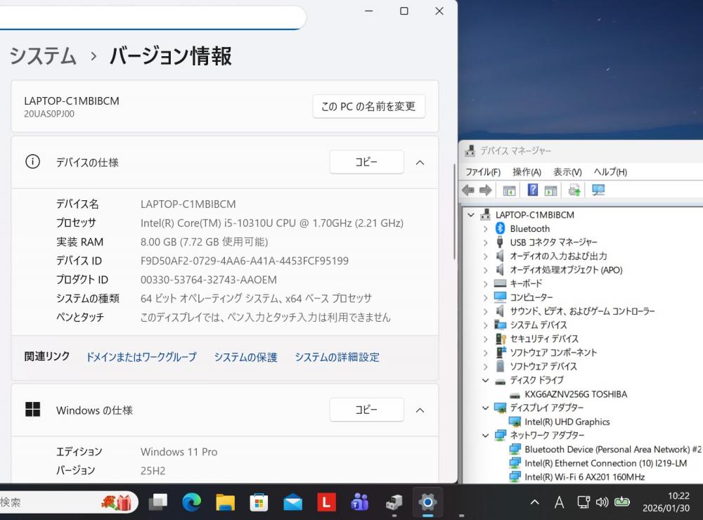 | CPU: 超高速 Intel 超高性能 第10世代Core i5-10310U 1.6Ghz、 4コア8スレッド (ターボ・ブースト利用時の最大周波数 4.2GHz) |