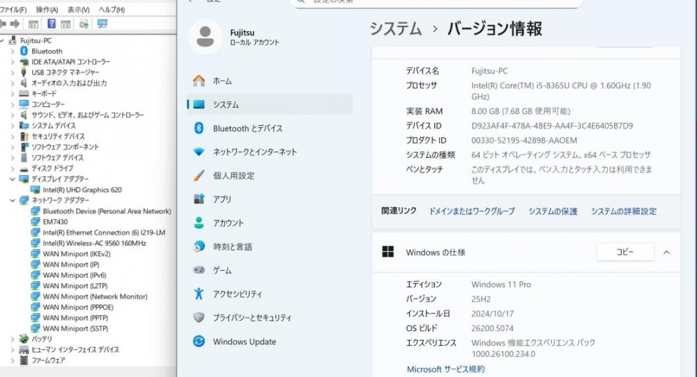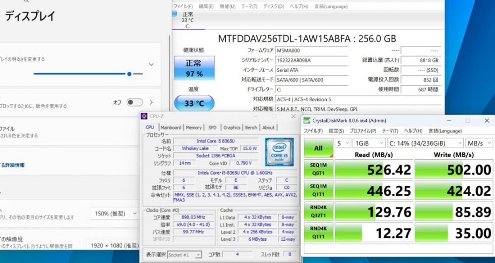| CPU: 超高速 Intel 高性能 第8世代Core i5-8365u 1.6Ghz、 4コア8スレッド (ターボ・ブースト利用時の最大周波数 4.1GHz) |