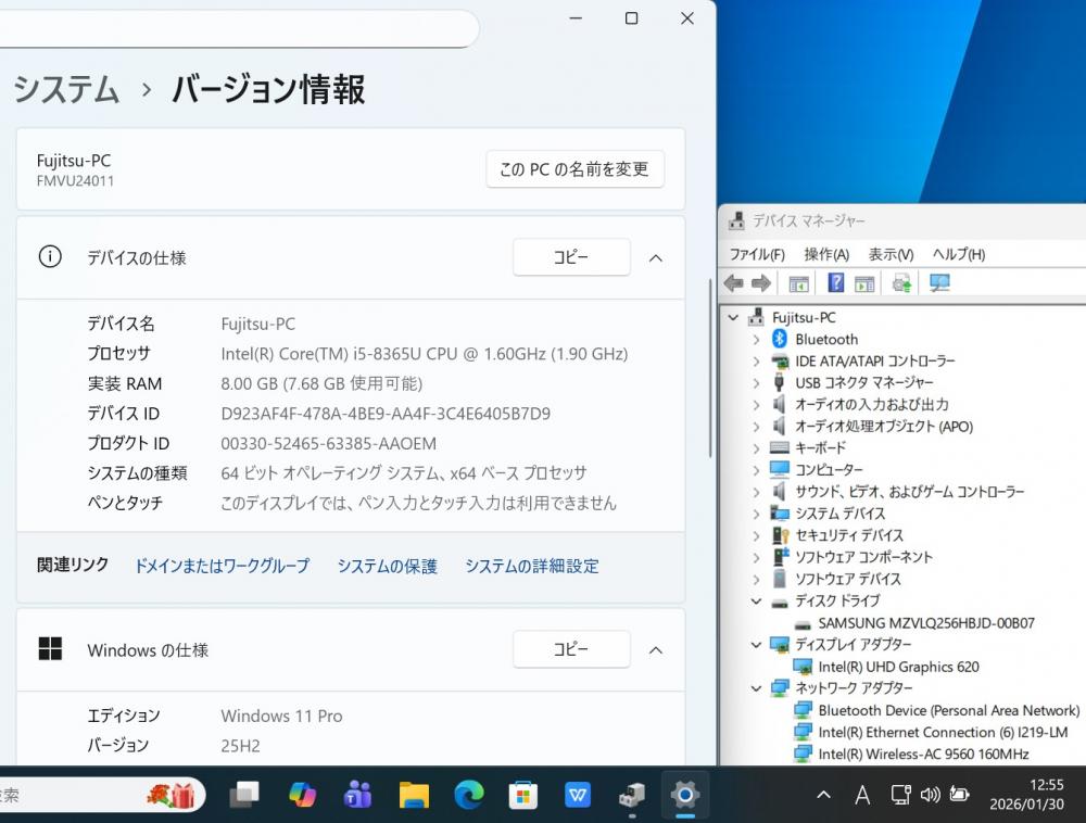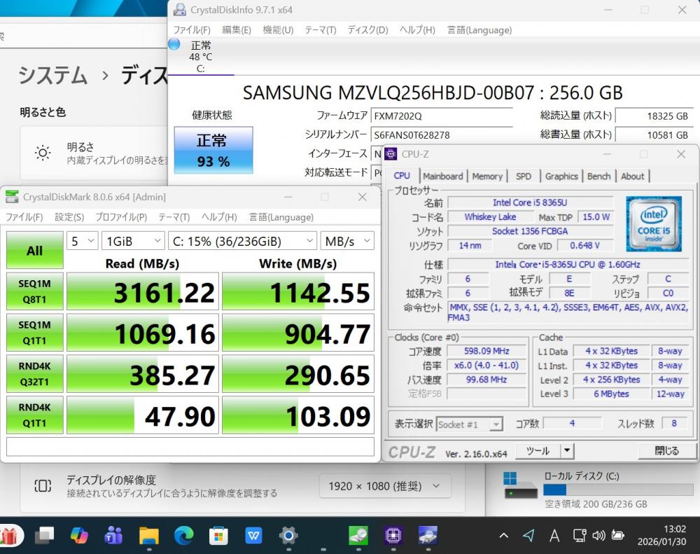 | CPU: 超高速 Intel 高性能 第8世代Core i5-8365U 1.6Ghz、 4コア8スレッド (ターボ・ブースト利用時の最大周波数 4.1GHz) |