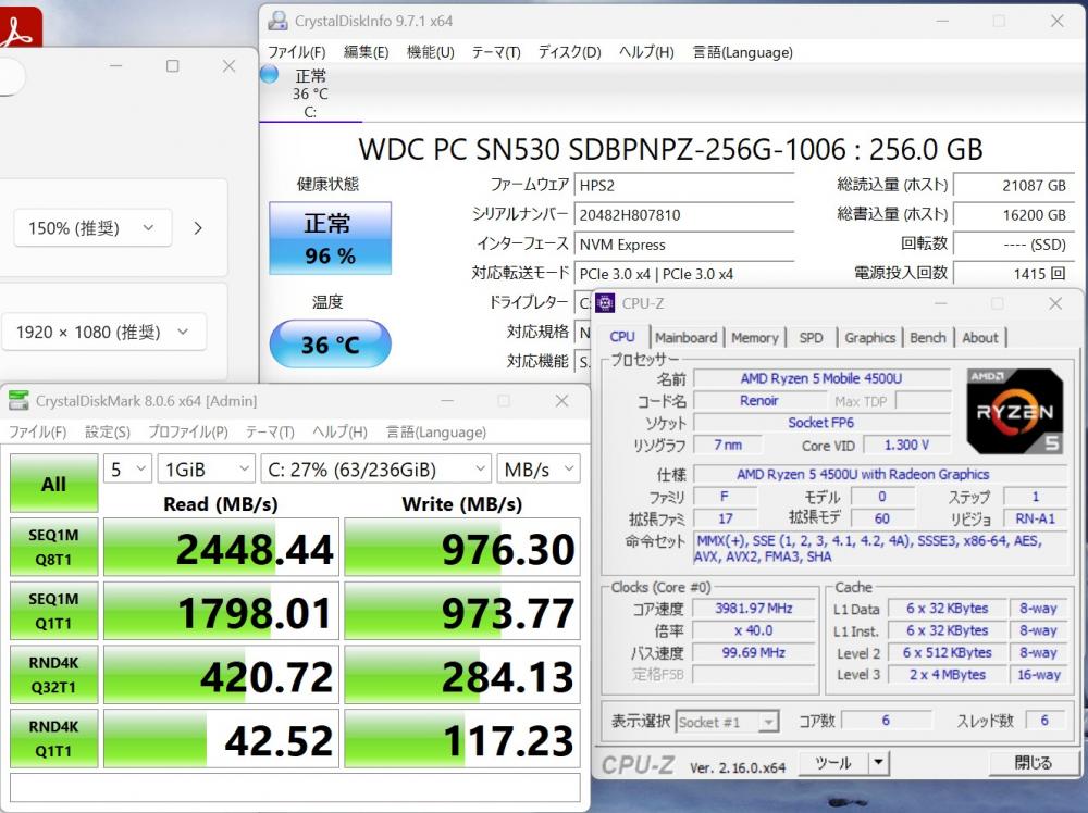 | CPU: 超高速 高性能 AMD Ryzen 5-4500U 2.3Ghz、 6コア (ターボ・ブースト利用時の最大周波数 4.0GHz) |