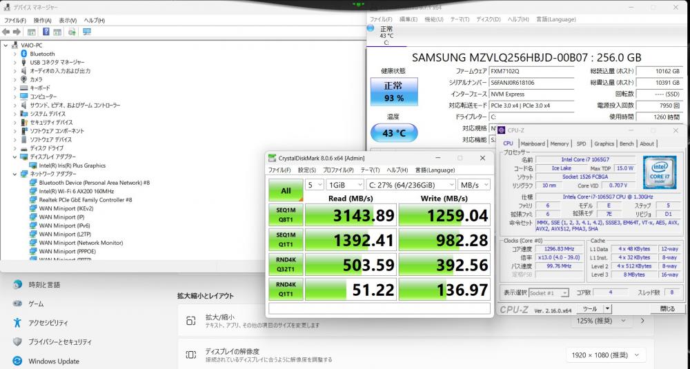 | CPU: 超高速 Intel 超高性能 第10世代Core i7-1065G7 1.3Ghz、 4コア8スレッド (ターボ・ブースト利用時の最大周波数 3.9GHz) |