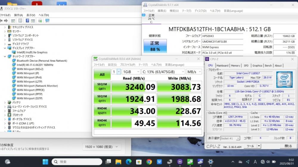 | CPU: 超高速 Intel 卓越性能 第11世代Core i7-1185G7 3.0Ghz、 4コア8スレッド (ターボ・ブースト利用時の最大周波数 4.8GHz) |