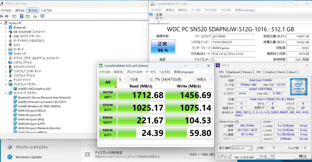 | CPU: 超高速 Intel 高性能 第8世代Core i7-8565U 1.8Ghz、 4コア8スレッド (ターボ・ブースト利用時の最大周波数 4.6GHz) |