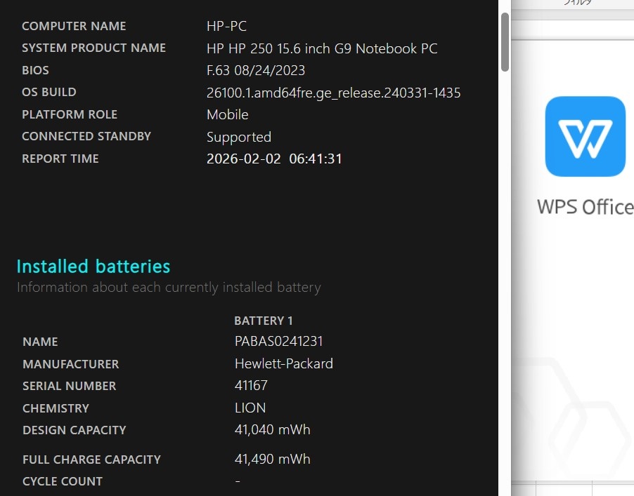 バッテリー電池の健康度は 100% です。4時間位も使用可能と表示されている。 バッテリーは消耗品の為、動作補償外となります。