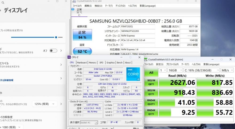 | CPU: 超高速 Intel 卓越性能 第12世代Core i3-1215u 1.2Ghz、 6コア8スレッド (ターボ・ブースト利用時の最大周波数 4.4GHz) |