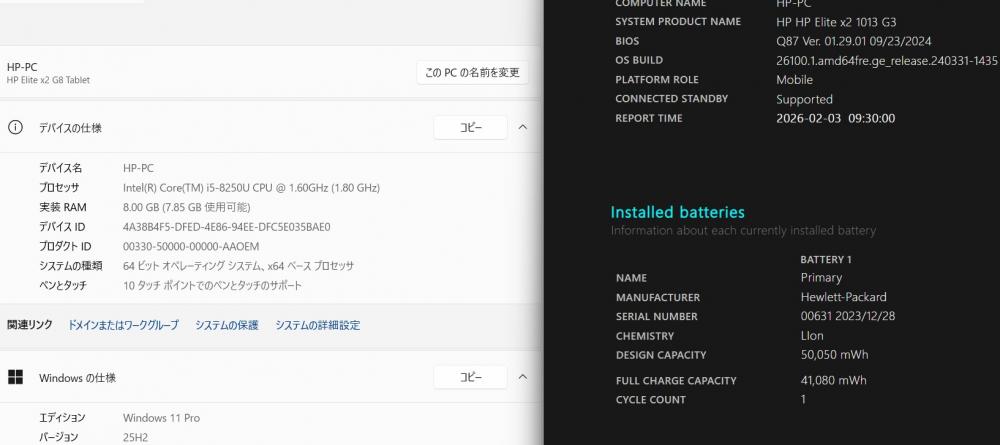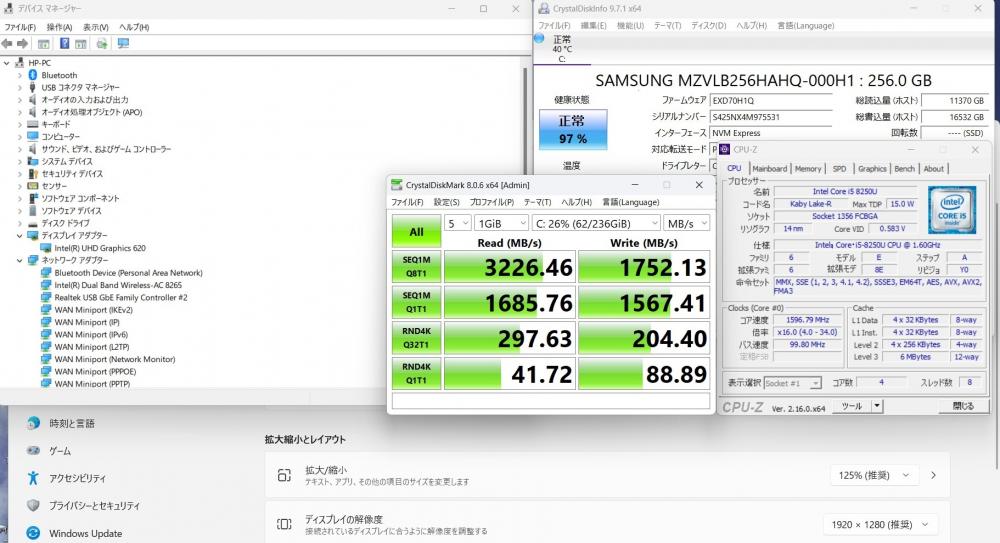 | CPU: 超高速 Intel 高性能 第8世代Core i5-8250U 1.6Ghz、 4コア8スレッド (ターボ・ブースト利用時の最大周波数 3.4GHz) |