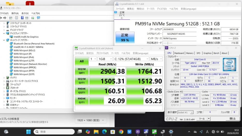 | CPU: 超高速 Intel 卓越性能 第11世代Core i5-1145G7 2.6Ghz、 4コア8スレッド (ターボ・ブースト利用時の最大周波数 4.4GHz) |