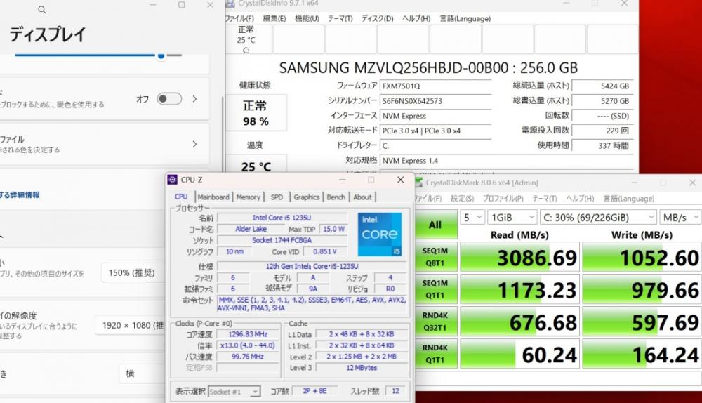 CPU:    超高速 Intel 10コア 卓越性能 第12世代Core i5-1235u 1.3Ghz、 10コア12スレッド (ターボ・ブースト利用時の最大周波数 4.4GHz)