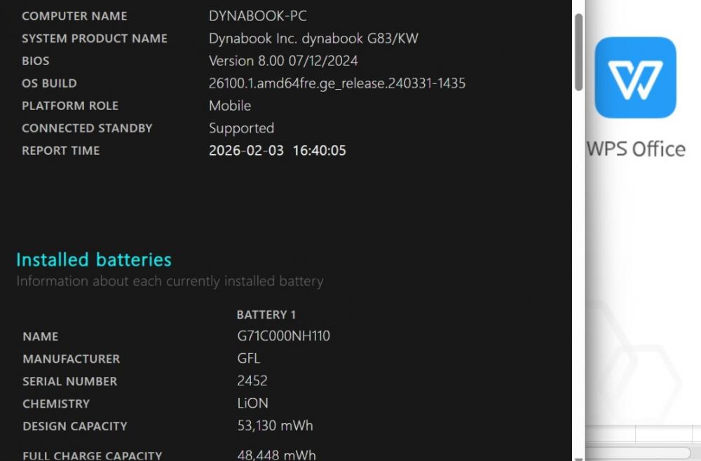 バッテリー電池の健康度は 91% です。3時間半位も使用可能と表示されている。 バッテリーは消耗品の為、動作補償外となります。