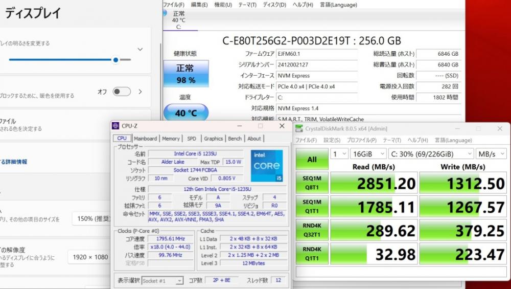 CPU:    超高速 Intel 10コア 卓越性能 第12世代Core i5-1235u 1.3Ghz、 10コア12スレッド (ターボ・ブースト利用時の最大周波数 4.4GHz)