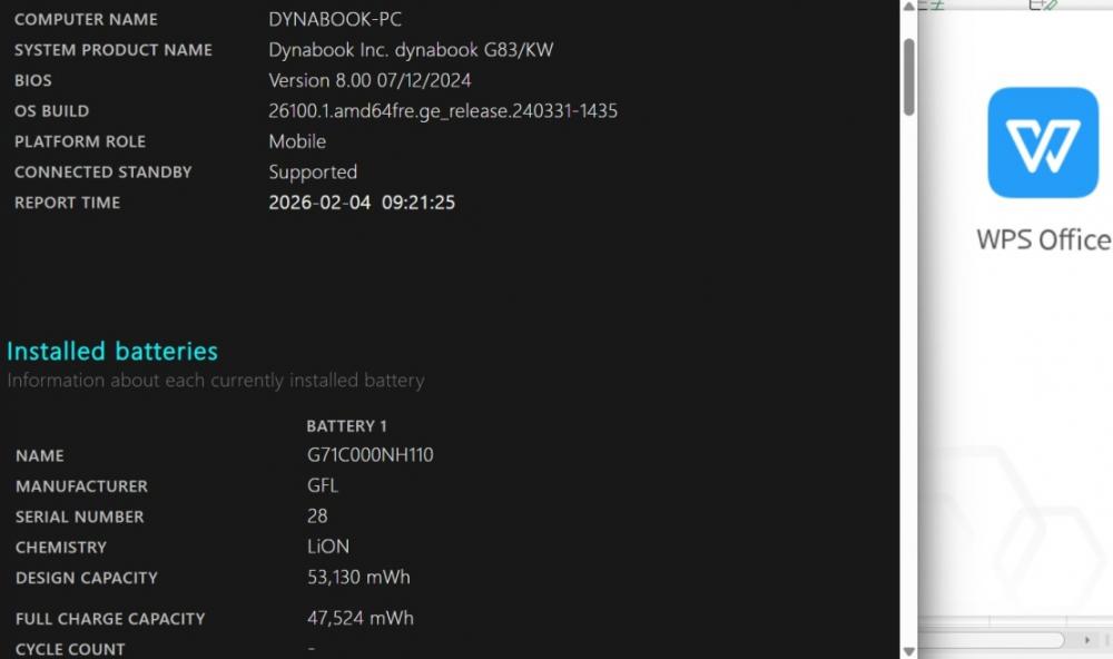 バッテリー電池の健康度は 89% です。3時間半位も使用可能と表示されている。 バッテリーは消耗品の為、動作補償外となります。