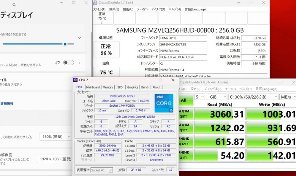 CPU:    超高速 Intel 10コア 卓越性能 第12世代Core i5-1235u 1.3Ghz、 10コア12スレッド (ターボ・ブースト利用時の最大周波数 4.4GHz)