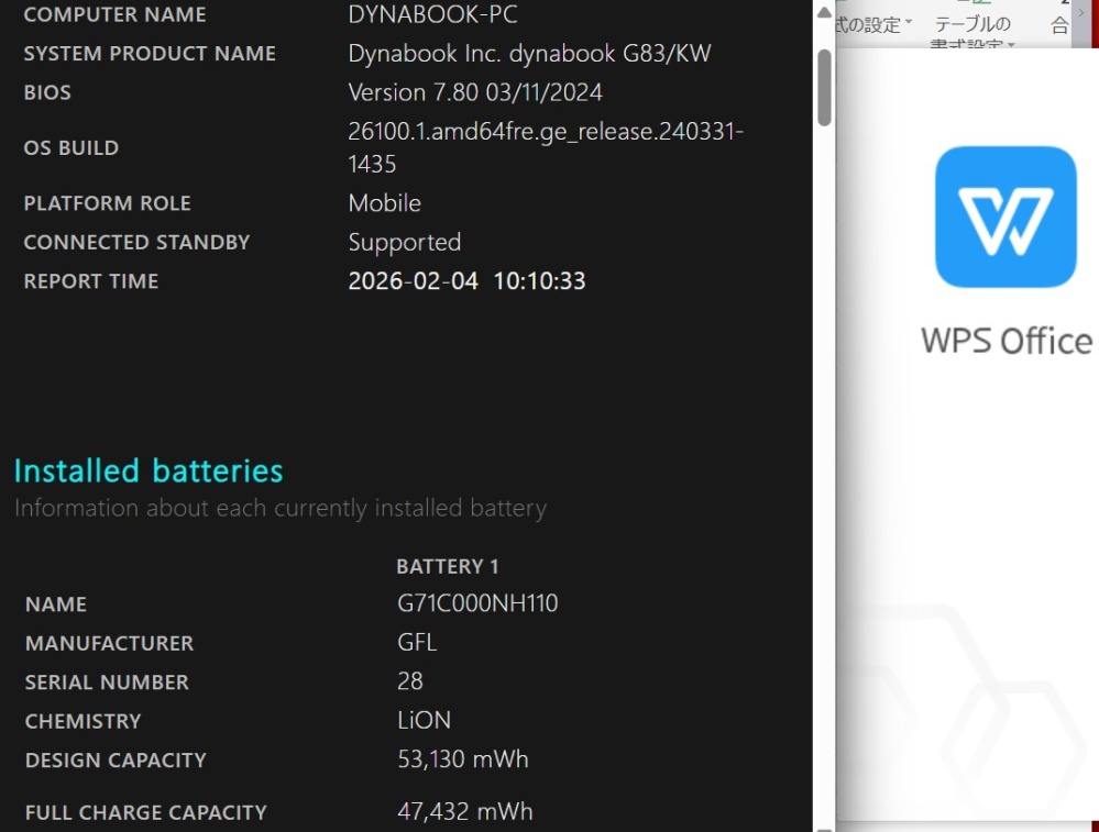 バッテリー電池の健康度は 83% です。3時間半位も使用可能と表示されている。 バッテリーは消耗品の為、動作補償外となります。