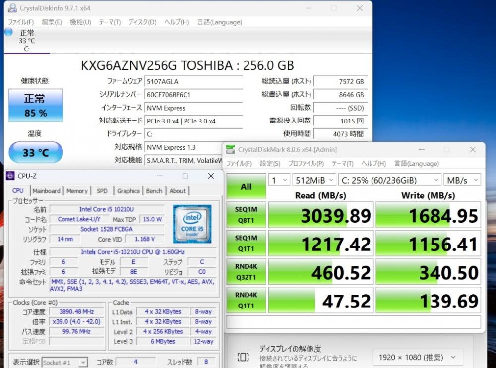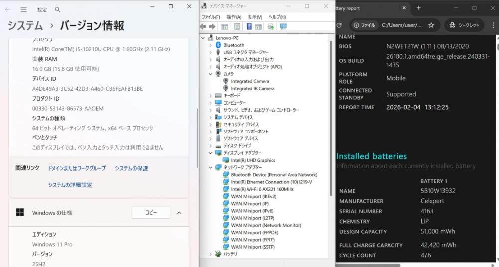 | CPU: 超高速 Intel 超高性能 第10世代Core i5-10210U 1.6Ghz、 4コア8スレッド (ターボ・ブースト利用時の最大周波数 4.2GHz) |