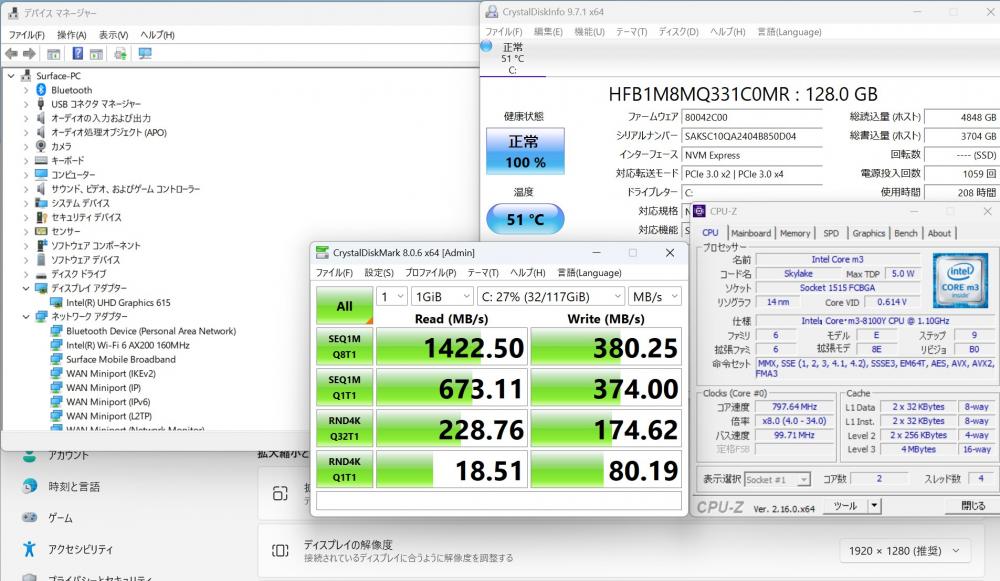 | CPU: 高速 Intel CoreM 3-8100Y 1.1Ghz、 2コア4スレッド (ターボ・ブースト利用時の最大周波数 3.4GHz) |