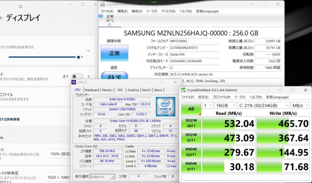 CPU:    超高速 Intel 高性能 第8世代Core i5-8250u 1.6Ghz、 4コア8スレッド (ターボ・ブースト利用時の最大周波数 3.4GHz)