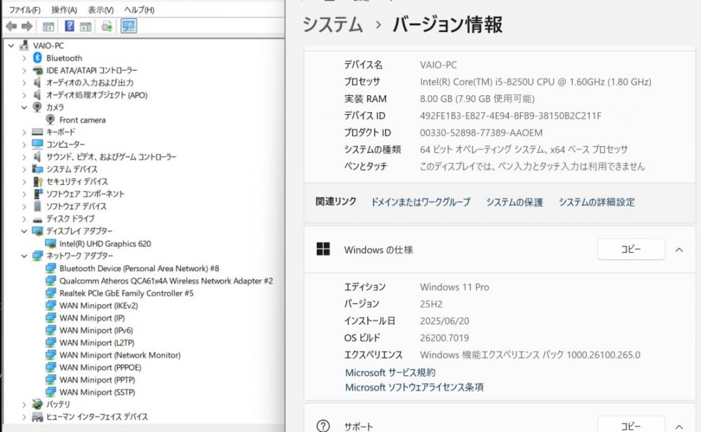 中古 フルHD 13.3型 SONY VAIO VJPG11C11N Windows11 第8世代 i5-8250u 8GB 256GB-SSD カメラ 無線 Office付き 中古パソコン 管:1552s