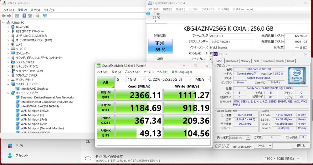 | CPU: 超高速 Intel 超高性能 第10世代Core i5-10310U 1.7Ghz、 4コア8スレッド (ターボ・ブースト利用時の最大周波数 4.4GHz) |