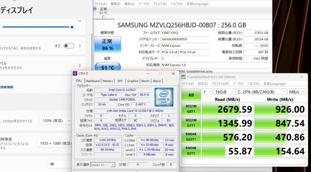 | CPU: 超高速 Intel 卓越性能 第11世代Core i5-1135G7 2.4Ghz、 4コア8スレッド (ターボ・ブースト利用時の最大周波数 4.2GHz) |